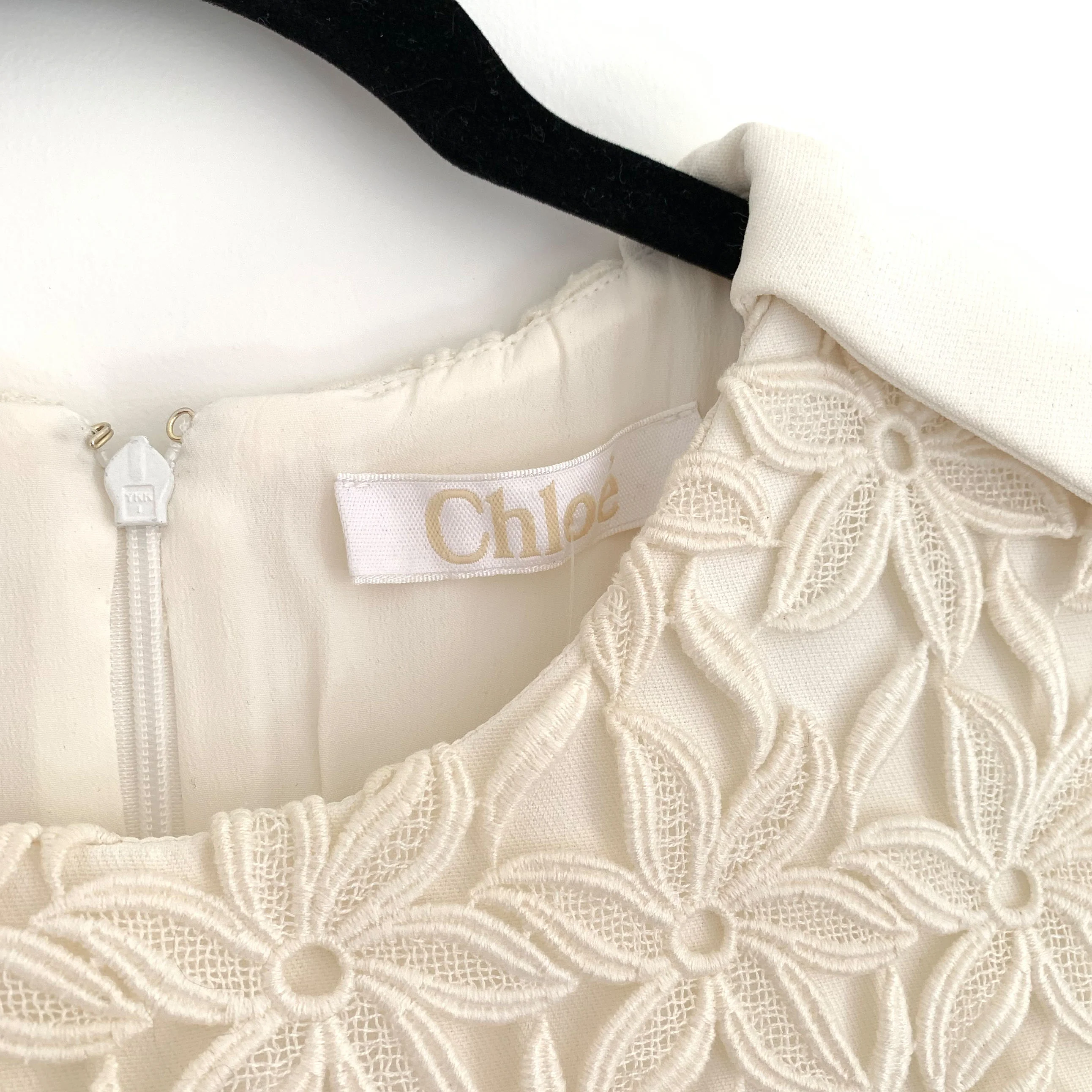 CHLOÉ ecru A-line dress with shoulder strap details, flower lace panel on the top and front slip-pockets