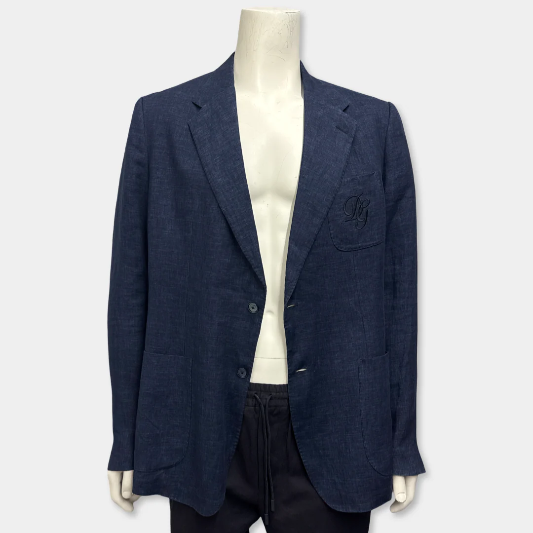 Elevate your formal wardrobe with this blue and white linen suit by Dolce & Gabbana. Crafted for ultimate comfort and style, these pieces add a touch of sophistication and modern twist to one's wardrobe. The lightweight linen fabric makes it perfect for summer evenings or layered on cooler days. The jacket features an elegant embroidered logo detail on the pocket, offering a subtle nod to luxury.