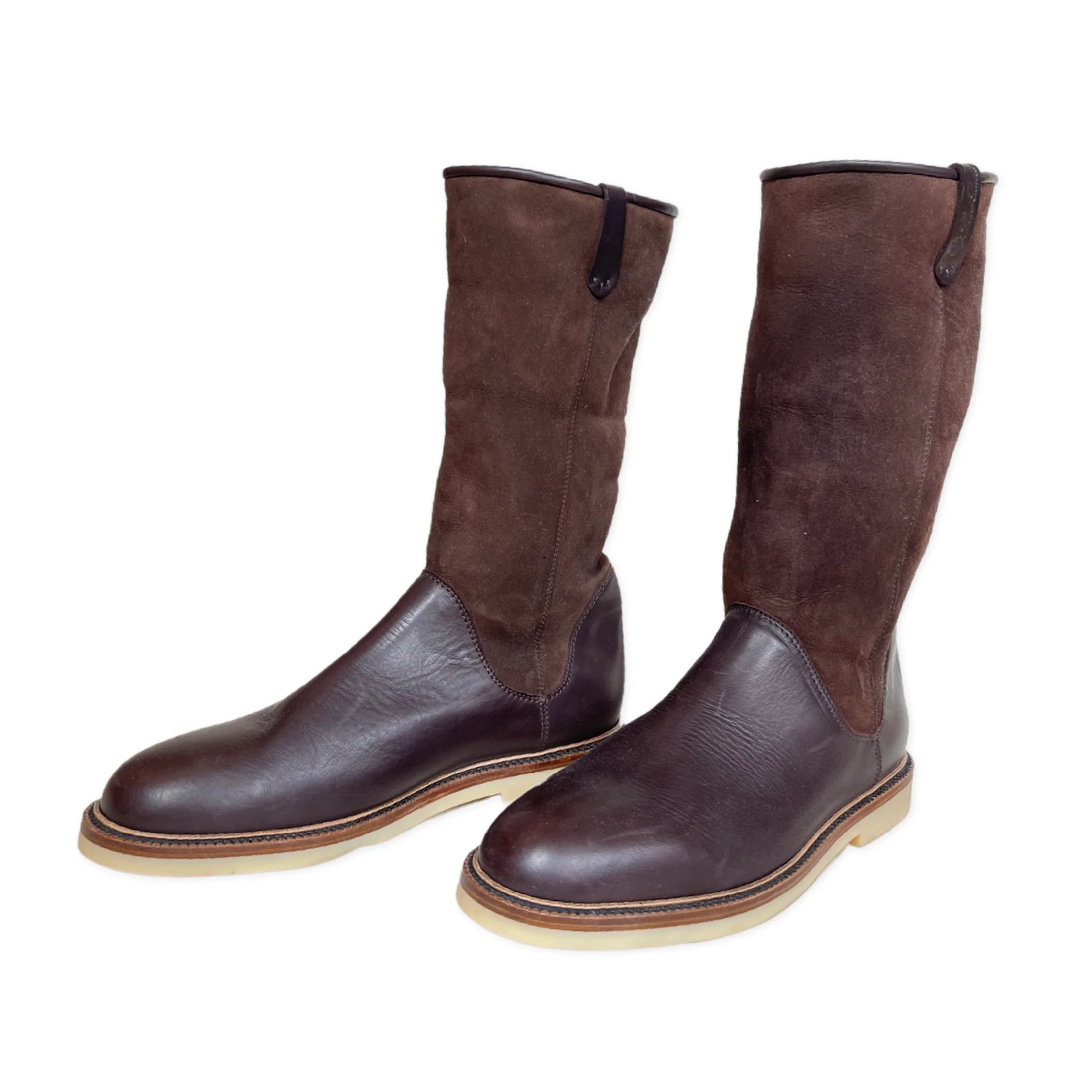 LORO PIANA Snow Walk brown shearling-lined suede and leather boots. They're finished with handy pull-tabs that are embossed with the brand's logo – use them to fold the sides up or down depending on the length of your trousers.